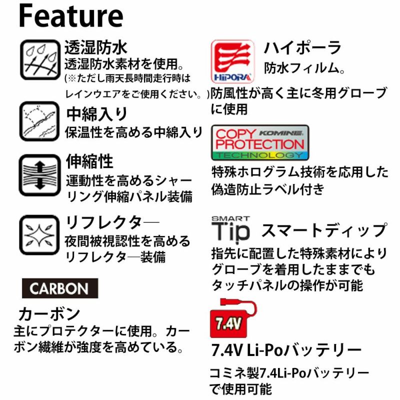 より暖かく、しなやかに、指先を包み込むように暖める新型マイクロカーボンファイバーヒーターを採用。従来型のヒーターの配置を見直し、指先の暖かさを強化。グローブ本体は電源OFF時でも高機能ウインターグローブとして使用可能。