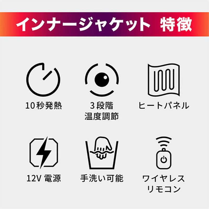 ●ヒートパネル:6ヶ所(首/両胸/両腕/背中)●ヒートシステム:3段階温度設定