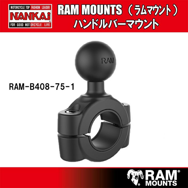 3/4-1インチのハンドルバーに取り付けることが出来るマウント。品番:RAM-B408-75-1 RAM MOUNTS ラムマウント ハンドルバーマウント/ 1インチボール