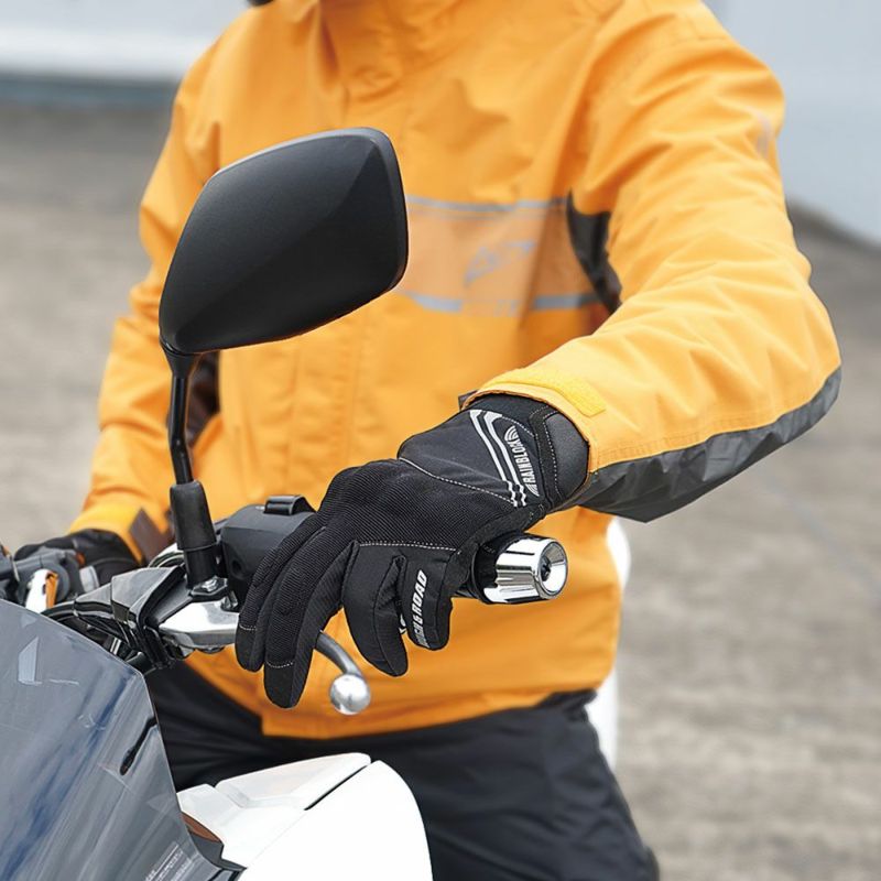 雨天時のみならず、普段から快適に使えるレイングローブに、内蔵式ナックルガードを装備してプロテクション性を確保し、リフレクタープリントで視認性を高め、安全性をプラス。