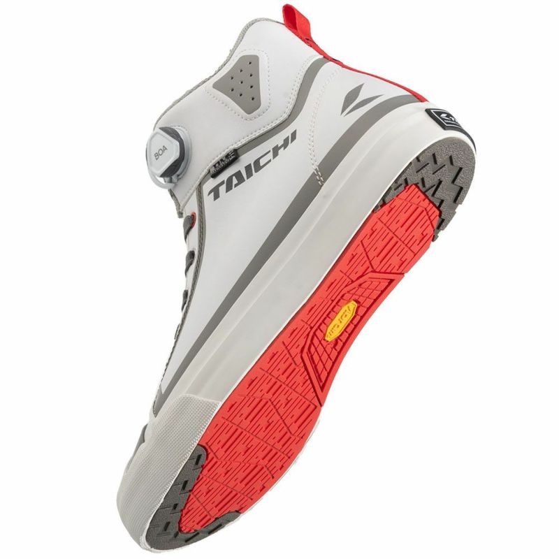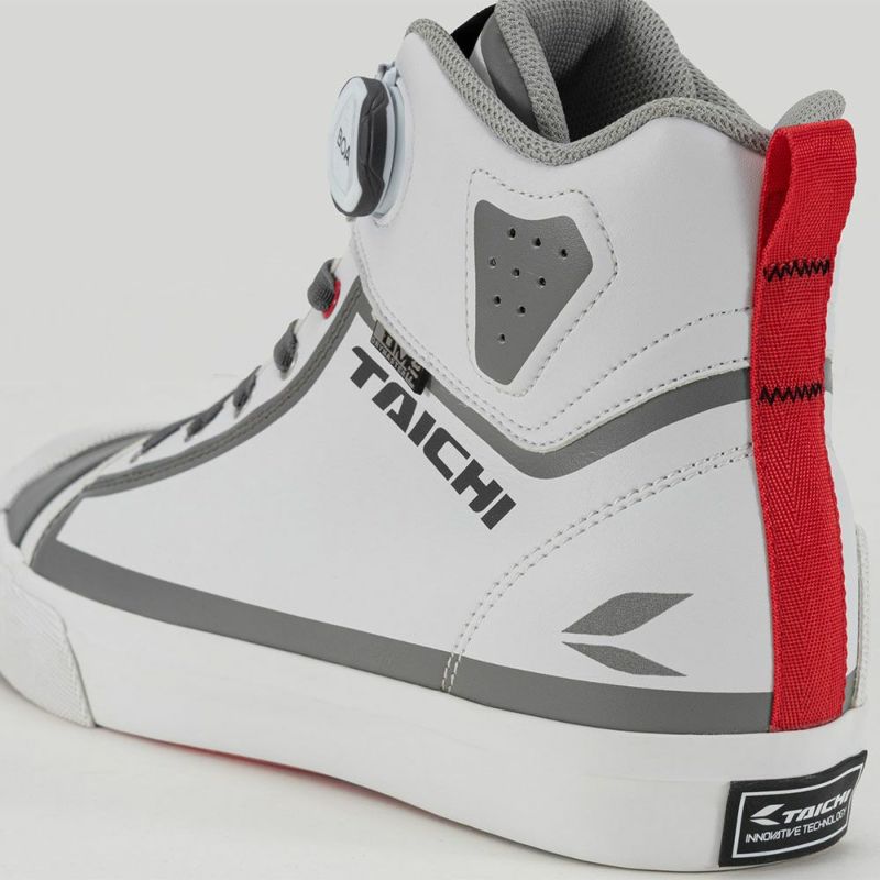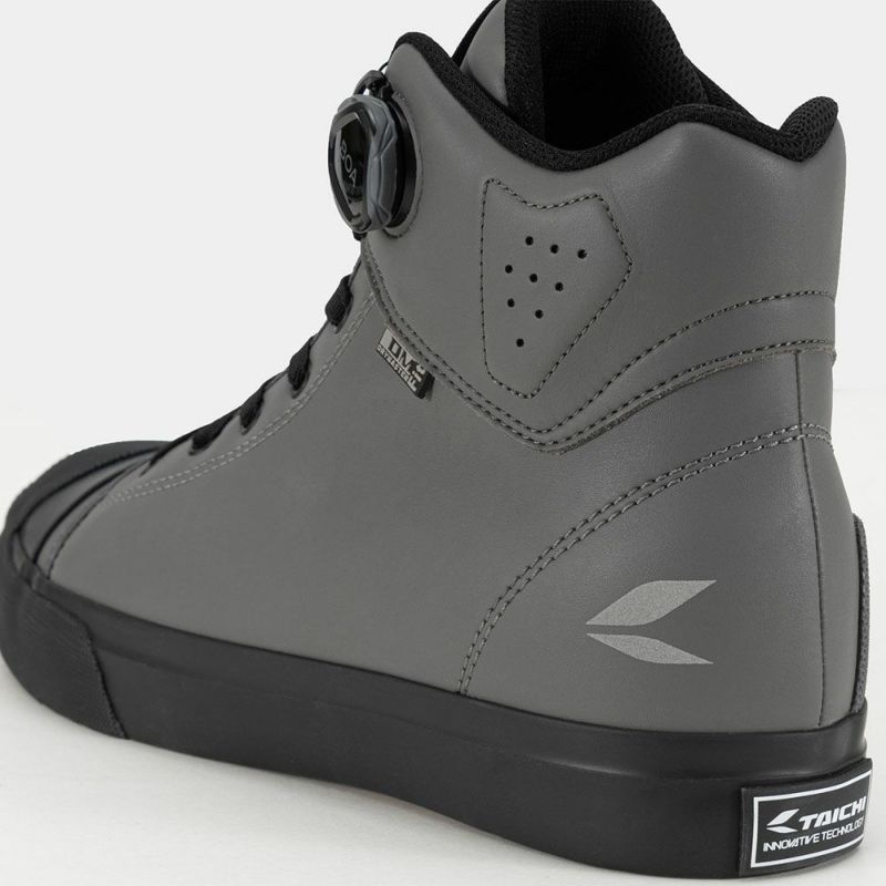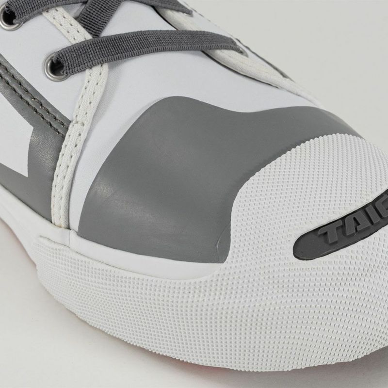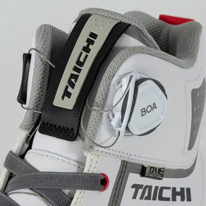 アッパー内部にはTAICHIオリジナルの防水・透湿素材"ドライマスター"を採用し、全天候での使用に対応。表地にはカジュアルなキャンバス地のほか、TECH WHITE・GRAY/BLACK・ALL BLACKには耐久性に優れ、メンテナンスも容易な合成皮革“Clarino®”を、CORDURA KHAKI・CORDURA BLACKにはナイロンの7倍もの強度をもつ耐久性に優れた繊維“CORDURA®”を使用し、コーディネートの幅を広げました。ソールにはvibram社との共同開発により、ライディングに必要と考えられるグリップや排水性を考慮したハイグリップソールを採用。 また、かかと内側には新たにヒールガードを採用し、シューズ本体へのダメージを軽減。 タウンシューズの様なデザインながらもライディングに必要な機能を盛り込みました。