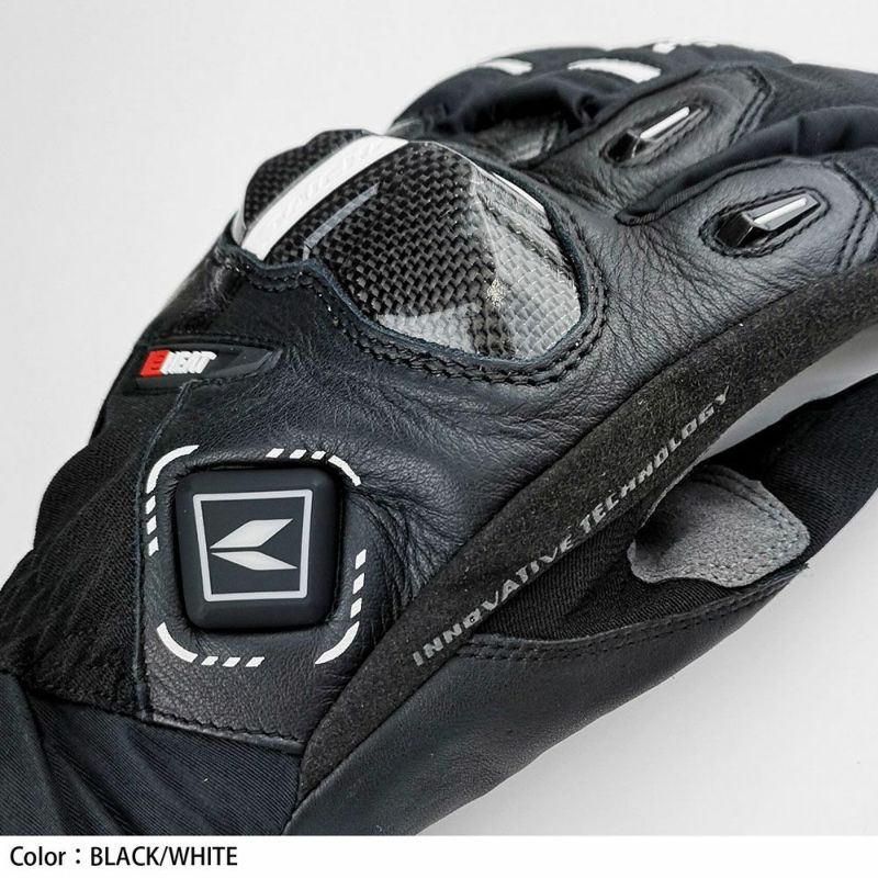 ナックル&パームプロテクターにカーボン素材を使用し、高いプロテクション機能と保温性を兼ね備えた、ロングカフモデルの電熱グローブ。