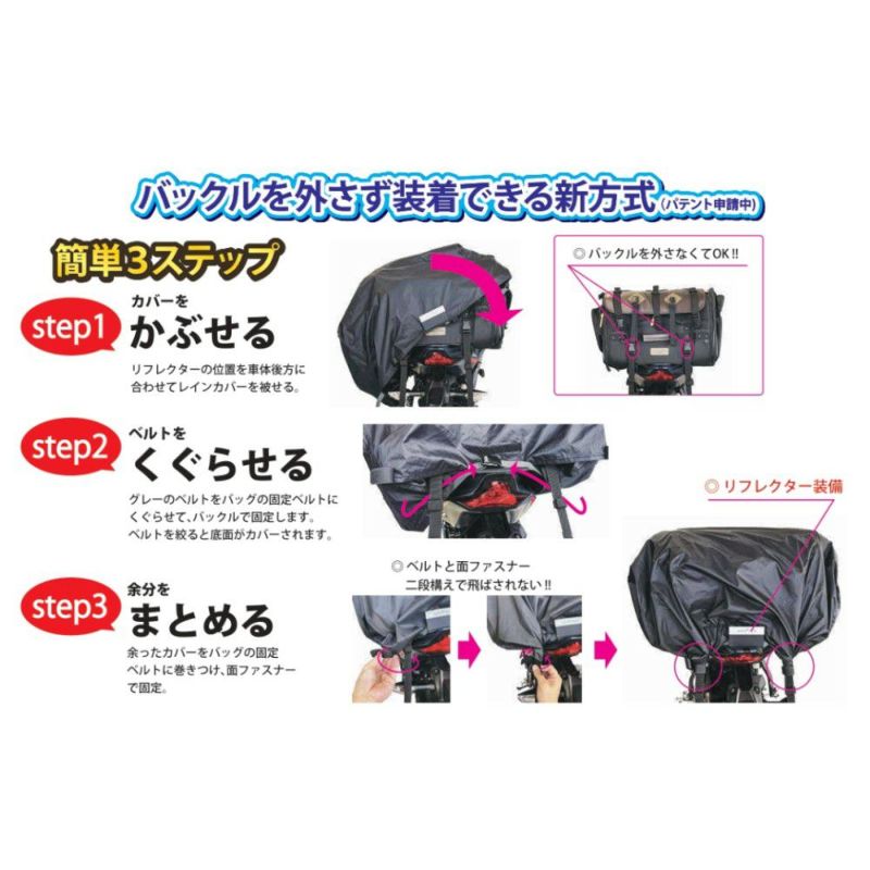 新取り付け方式!バタつきが抑えられた新型レインカバー!バックルを外さず装着できる新方式(パテント申請中)