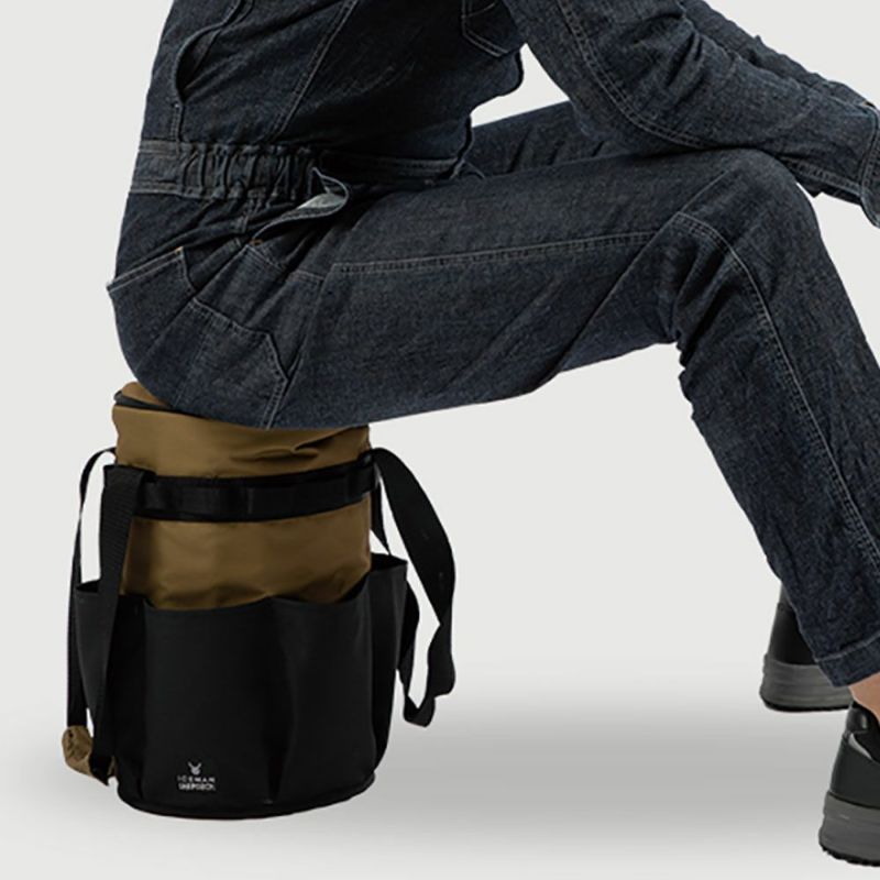 ダブル持ち手構造で、持ち上げた時の持ち手への負荷を分散させます。車でも持ち運べるサイズで、 レジャーや作業現場でアイスマンの使用を長時間しっかりサポートします。エネポーチ(別売)と組み合わせて使用した場合、上に座ることもできます。