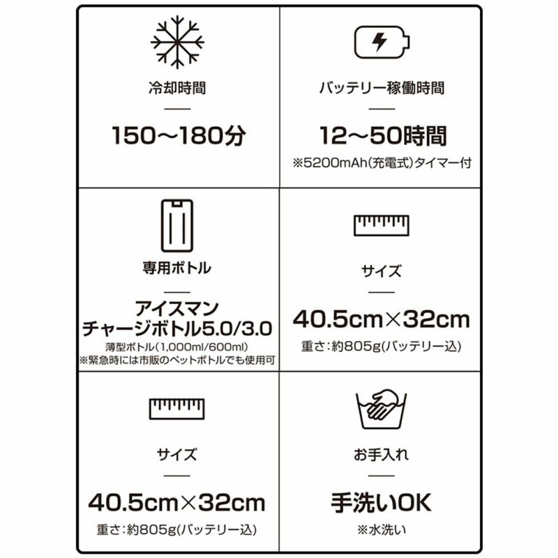 ●アイスドリップコントロール方式で猛暑時でもチャージボトル1本で2時間30分から3時間は使用可能で速攻冷感が体感できます。