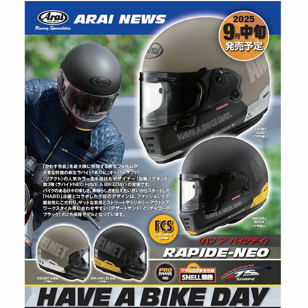 他の画像を見る クラシックスタイルで大人気のラパイドNEO 「HABD」企画とコラボ マットな質感 ヘルメット Arai アライ フルフェイス RAPIDE-NEO HAVE A BIKEDAY(ハブ ア バイクデイ) 販売価格 ¥ 71,500 税込 クラシックスタイルで大人気のラパイドNEO 「HABD」企画とコラボ マットな質感 カートに入れる お気に入りに登録する ARAI 在庫切れ・入荷連絡