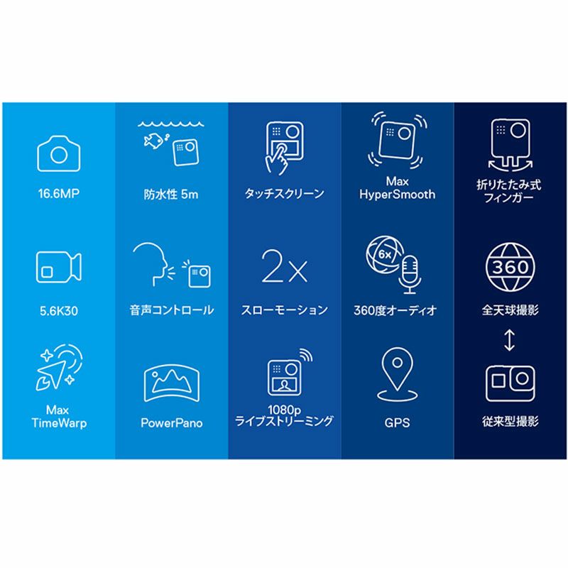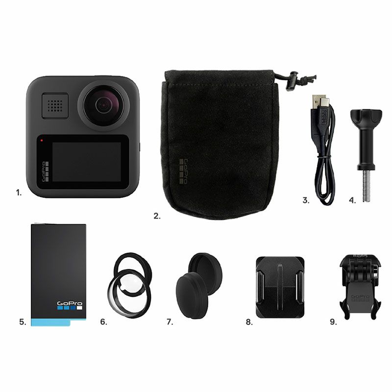 GoPro MAX カメラ|マイクロファイバー バッグ|USB-C ケーブル|サムスクリュー|充電式バッテリー|保護レンズ x 2|レンズ キャップ x 2|粘着性ベース マウント (曲面)|マウント用バックル|携帯用ケース