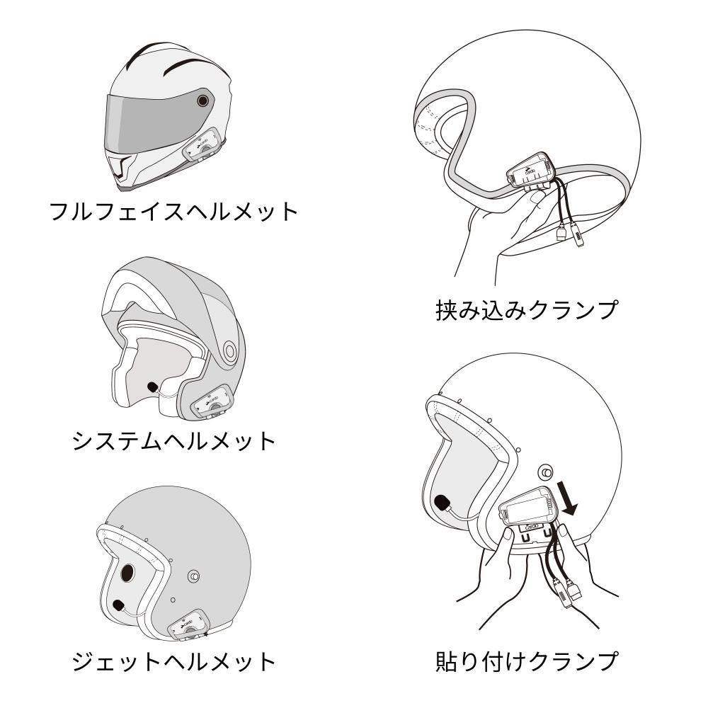 シンプルなヘルメット取り付け挟み込みクランプ、または貼り付けクランプ(フチの厚みが5mm以上の場合)で様々なヘルメットに取り付け可能です。ケーブルマイク・アームマイクの2種類が付属し、ヘルメットに合わせて使い分けできます。 ※ハーフヘルメットの方や付属アームマイクの長さが足りない場合は、別売り「FREECOM/SPIRIT-Half Helmet Kit」をご購入ください。 |