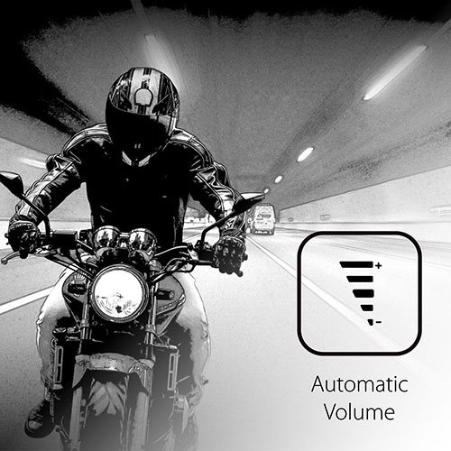 ー 外部環境音に合わせて自動で音量調整 本体内蔵マイクが周囲の騒音や風切り音を感知し、スピーカー音量とマイク感度を自動で調整。 高速道路やトンネルでは音量が上がり、信号待ちの間は元に戻るため、手動で調整するストレスがありません。 |