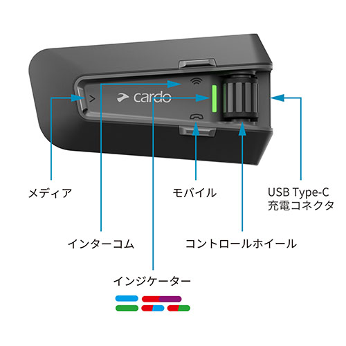 ー 充実スペック・便利な機能 バッテリー 最大13時間の連続通話が可能。急速充電(20分の充電で最大2時間の通話)に対応し、モバイルバッテリー等で充電しながらの使用もできます。 ミュージック&トーク スマホの音楽を聴きながら、インカム通話ができます。※1 ※2 ミュージックシェア 自分が聞いているスマホの音楽を、インカム相手に共有できます。(タンデム推奨。PACKTALK同士でミュージックシェアしている場合を除き、シェア中はインカム通話が中断されます)※1 ※2 2デバイス同時接続 例えば音楽用スマホ+電話用スマホの2台をペアリングしておくと、音楽リスニング中にもう一台の電話に出ることができます。※1 短縮ダイヤル よく使う電話番号を4つまで登録できます。ボイスコマンドを使用すれば、ハンズフリーで電話することもできます。 ※1 機種や使用環境によりうまく動作しない場合があります。 ※2 インカムの接続対象は、カルド同士かつ同一のBluetoothバージョンの場合に限ります。 |