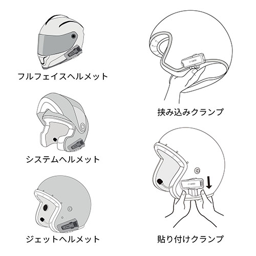 ー シンプルなヘルメット取り付け 挟み込みクランプ、または貼り付けクランプ(フチの厚みが5mm以上の場合)で様々なヘルメットに取り付け可能です。 ケーブルマイク・アームマイクの2種類が付属し、ヘルメットに合わせて使い分けできます。 ※ハーフヘルメットの方や付属アームマイクの長さが足りない場合は、別売り「PACKTALK PRO/EDGE - Half Helmet Kit」をご購入ください。 |