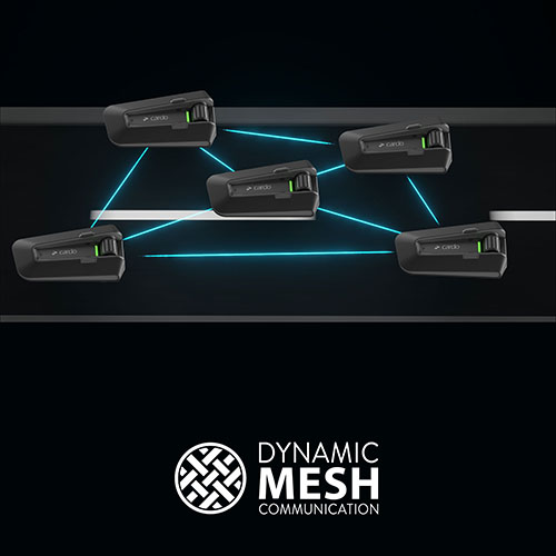 ー 次世代メッシュ通信に対応 ダイナミックメッシュコミュニケーション(DMC)とは、1対1のBluetooth接続と異なり、複数のインカム同士が1つのグループ内で網目のように繋がる通信方式です。 インカム同士のペアリングや走行中の通信にまつわる、従来のBluetoothインカムの悩みを解決してくれるカルドの先端技術です。 |