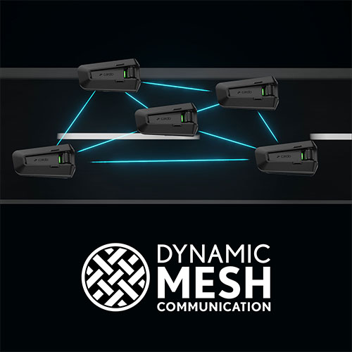 ー 次世代メッシュ通信に対応 ダイナミックメッシュコミュニケーション(DMC)とは、1対1のBluetooth接続と異なり、複数のインカム同士が1つのグループ内で網目のように繋がる通信方式です。 インカム同士のペアリングや走行中の通信にまつわる、従来のBluetoothインカムの悩みを解決してくれるカルドの先端技術です。 |