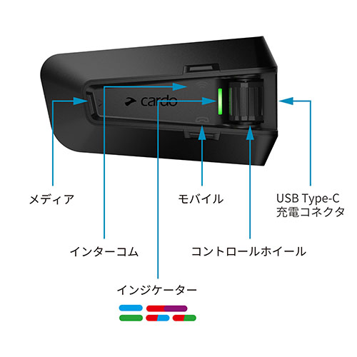 ー 充実スペック・便利な機能 バッテリー 最大13時間の連続通話が可能。急速充電(20分の充電で最大2時間の通話)に対応し、モバイルバッテリー等で充電しながらの使用もできます。 ミュージック&トーク スマホの音楽を聴きながら、インカム通話ができます。※1 ※2 ミュージックシェア 自分が聞いているスマホの音楽を、インカム相手に共有できます。(タンデム推奨。PACKTALK同士でミュージックシェアしている場合を除き、シェア中はインカム通話が中断されます)※1 ※2 2デバイス同時接続 例えば音楽用スマホ+電話用スマホの2台をペアリングしておくと、音楽リスニング中にもう一台の電話に出ることができます。※1 短縮ダイヤル よく使う電話番号を4つまで登録できます。ボイスコマンドを使用すれば、ハンズフリーで電話することもできます。 ※1 機種や使用環境によりうまく動作しない場合があります。 ※2 インカムの接続対象は、カルド同士かつ同一のBluetoothバージョンの場合に限ります。 |