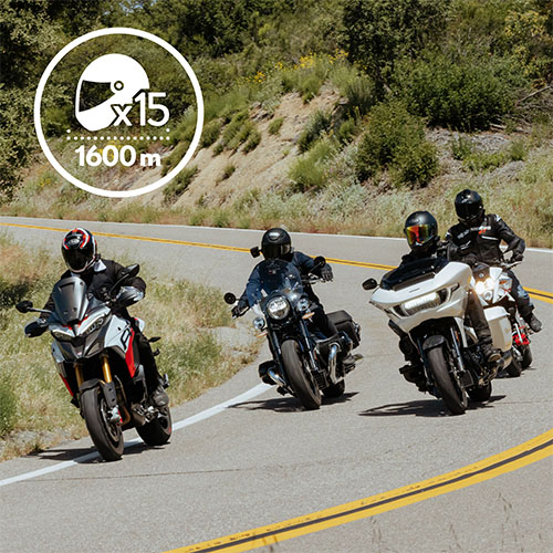 ー バイクライフのあらゆるシーンに最適 DMC接続の場合、最大通信距離1600m、自分を含む最大15人まで接続可能。 グループの大きさを問わずインカム接続が簡単なので、ペアでの気軽なお出掛けから、大集団でのマスツーリングまで、幅広いシーンで役立ちます。 ※Bluetooth接続の場合、自分を含む4人まで接続可能。 |