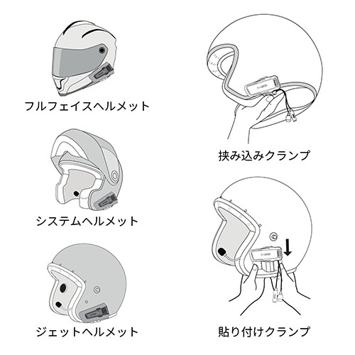 ー シンプルなヘルメット取り付け 挟み込みクランプ、または貼り付けクランプ(フチの厚みが5mm以上の場合)で様々なヘルメットに取り付け可能です。 ケーブルマイク・アームマイクの2種類が付属し、ヘルメットに合わせて使い分けできます。 ※ハーフヘルメットの方や付属アームマイクの長さが足りない場合は、別売り「PACKTALK PRO/EDGE - Half Helmet Kit」をご購入ください。 |
