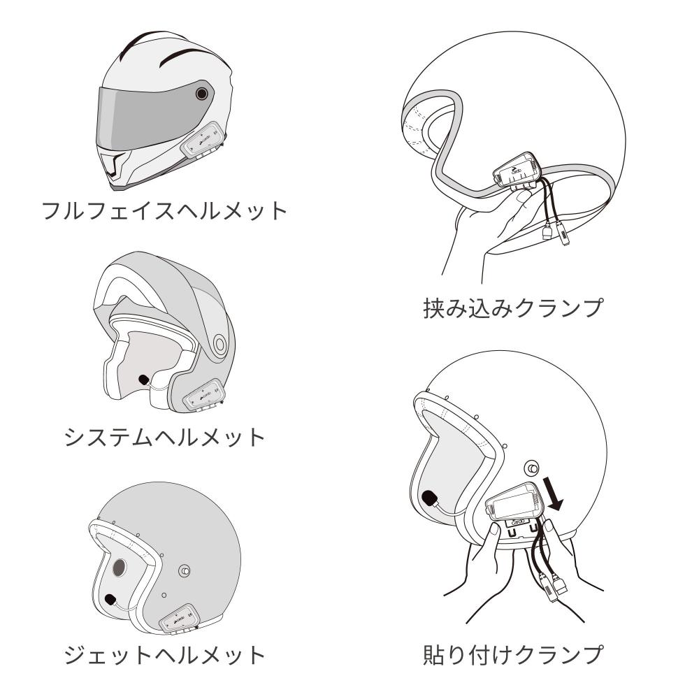 シンプルなヘルメット取り付け挟み込みクランプ、または貼り付けクランプ(フチの厚みが5㎜以上の場合)で様々なヘルメットに取り付け可能です。ケーブルマイク・アームマイクの2種類が付属し、ヘルメットに合わせて使い分けできます。 ※ハーフヘルメットの方や付属アームマイクの長さが足りない場合は、別売り「FREECOM/SPIRIT - Half Helmet Kit」をご購入ください。 |