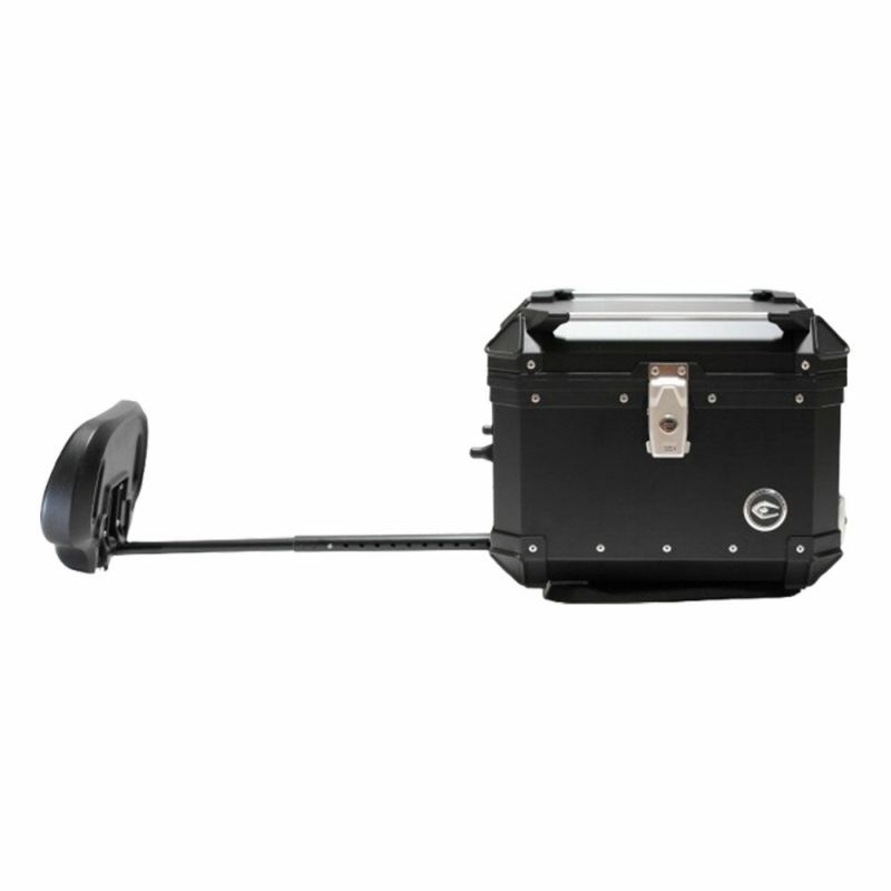 長さと角度が調整できるバックレストが標準装備された内容積目安45リットルのアルミトップケースです。