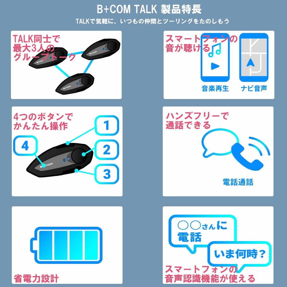 他の画像を見る 一緒につなげて、さぁ走りだそう。 “TALK”はインカム通話ができるだけではなく、 音楽再生、スマートフォン音声認識など B+COMの基本機能を備えた ベーシックモデルです。 サインハウス B+COM TALK ビーコム トークハイブリッドアームマイクUNIT 通常販売価格 ¥ 21,780 のところ 販売価格 ¥ 19,602 税込 一緒につなげて、さぁ走りだそう。 “TALK”はインカム通話ができるだけではなく、 音楽再生、スマートフォン音声認識など B+COMの基本機能を備えた ベーシックモデルです。 カートに入れる お気に入りに登録する