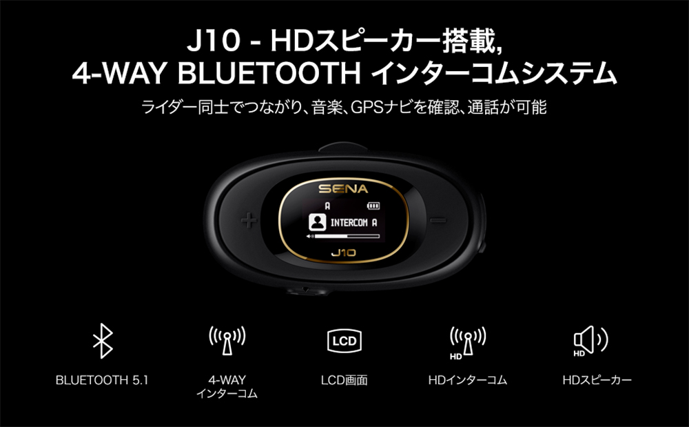 Sena J10 BluetoothR コミュニケーションインカムは、4-WAY HD インターコムとスマートフォン接続機能を備えており、音楽、GPS、電話の受信などが可能です。