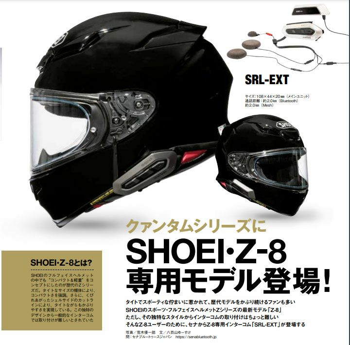 SRL-EXTは、SHOEI Z-8ヘルメット専用デザインです。メインモジュール、及びバッテリーパックは、Z-8のカーブ曲線に沿った形状のため、抵抗や風切り音を最大限に減らし、ヘルメットにピッタリとフィットするデザインです。