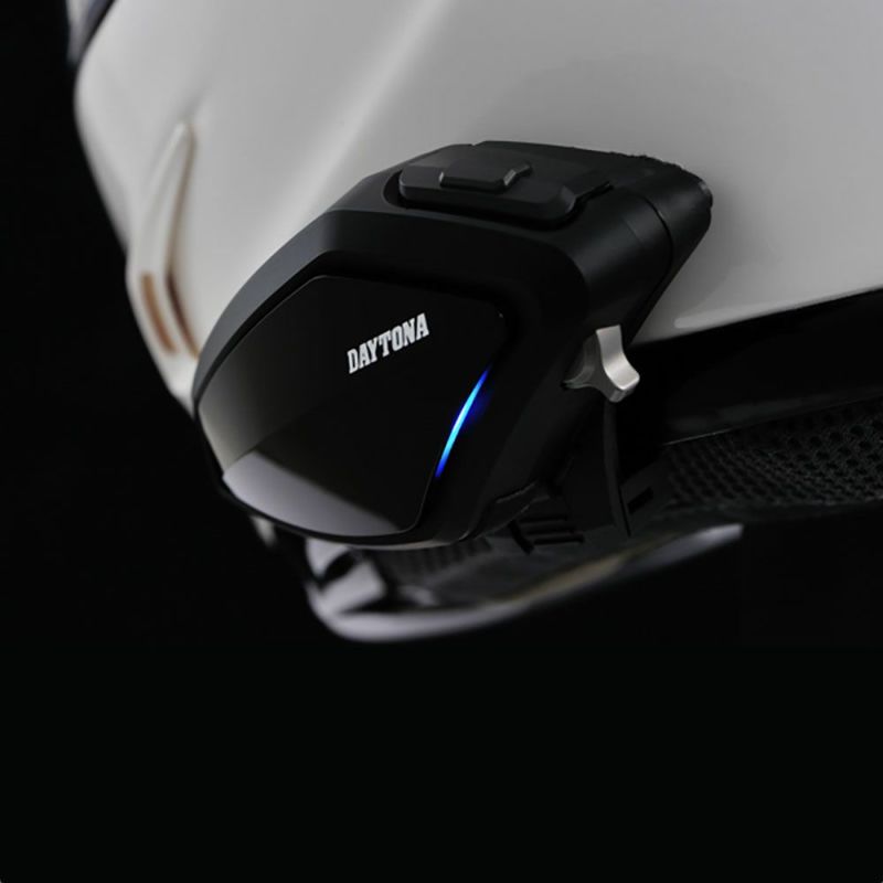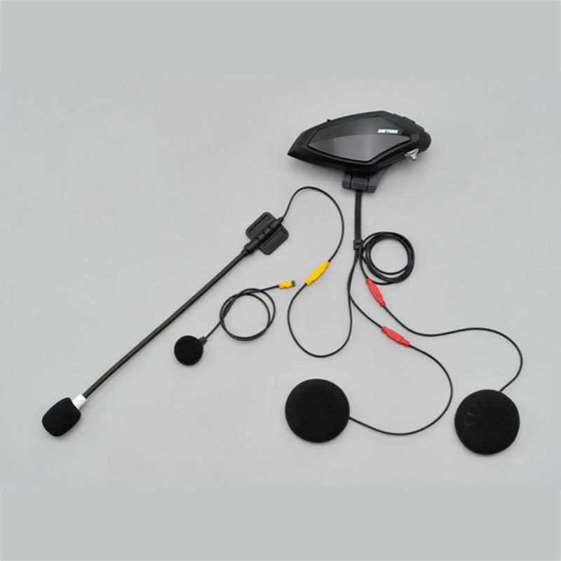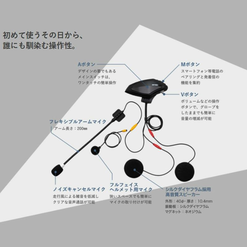 〇Gセンサー搭載:操作ボタンを押さなくてもデバイスやヘルメットを叩くだけで電話の受話、終話、音楽の再生、停止等が可能。