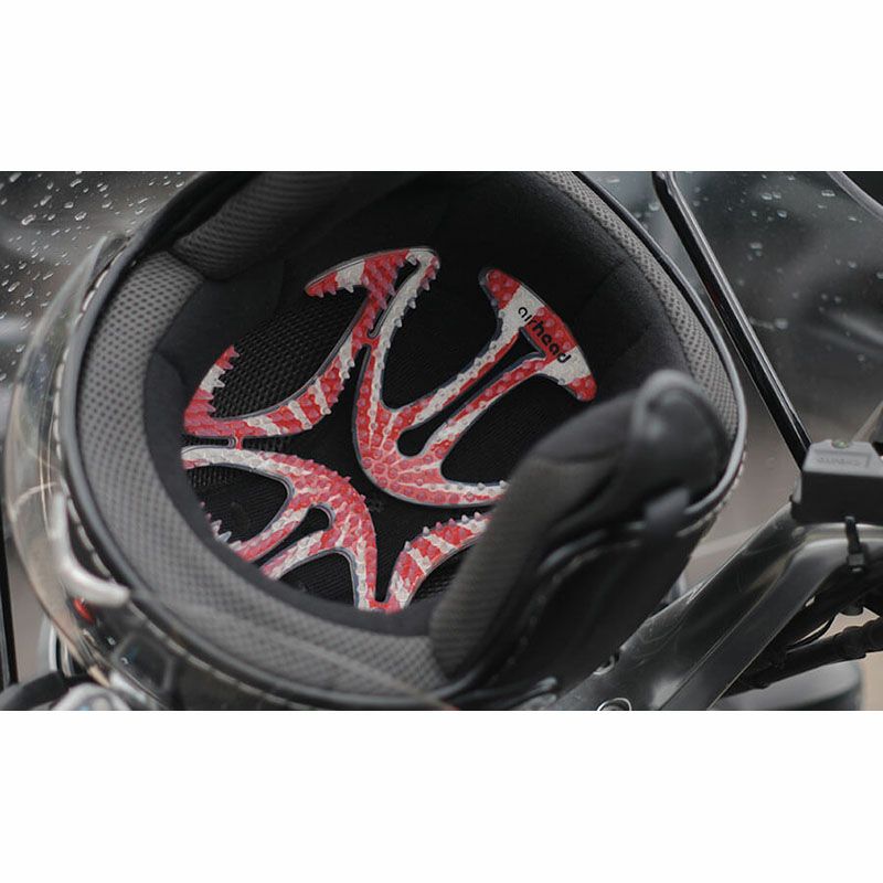 柔らかいシリコンでできたパッドをヘルメットの内側に貼り付け挿入することで、ヘルメットと頭皮の間に物理的な空間を作り出し、 ヘルメット内部に空気の流れを生みだします。これによりヘルメット内部の湿気、汗、そして髪がつぶれてしまうことを軽減します。 また、医療用レベルのシリコンを用い、静電気防止、抗菌、アレルギー対策加工を施しております。 ユニークな形状はどのようなヘルメットの内側にもぴったりフィットするように工夫された形です。ヘルメット内部が若干大きいと感じた際のサイズ調整としてもご使用いただけます。 -
