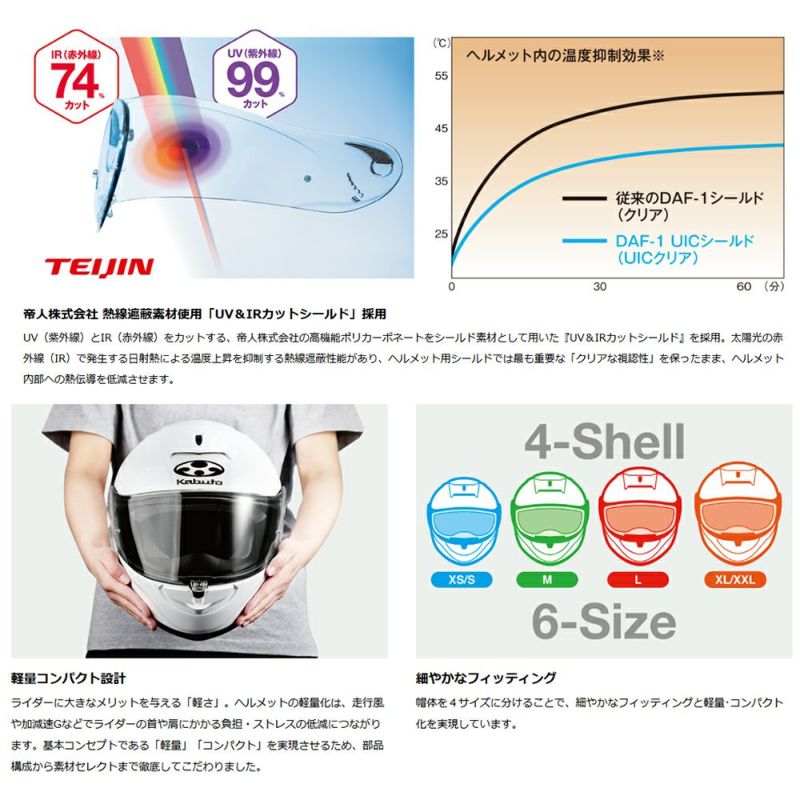 ●帝人株式会社 熱線遮蔽素材使用「UV&IRカットシールド」採用 UV(紫外線)とIR(赤外線)をカットする帝人株式会社の高機能ポリカーボネートを採用。 太陽光の赤外線による日射熱での温度上昇を抑制し、クリアな視認性を保ちながらヘルメット内部への熱伝導を低減します。 |