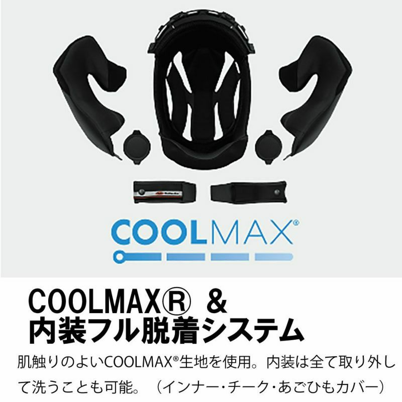肌触りのよいCOOLMAX生地を使用。内装は全て取り外して洗うことも可能。(インナー・チーク・あごひもカバー)