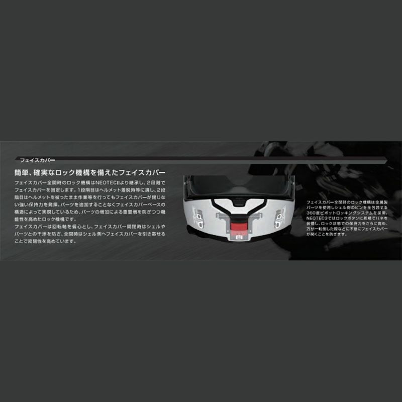フェイスカバー全開時のロック機構はNEOTEC IIより継承し、2段階でフェイスカバーを固定します。1段階目はヘルメット着脱時等に適し、2段階目はヘルメットを被ったまま作業等を行ってもフェイスカバーが閉じない強い保持力を発揮。パーツを追加することなくフェイスカバーベースの構造によって実現しているため、パーツの増加による重量増を防ぎつつ機能性を高めたロック機構です。 フェイスカバーは回転軸を偏心とし、フェイスカバー開閉時はシェルやパーツとの干渉を防ぎ、全閉時はシェル側へフェイスカバーを引き寄せることで密閉性を高めています。