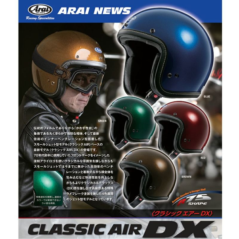 70年代前半に使用していたフロントマークをイメージした 復刻アライロゴを使いクラシカルな雰囲気を醸しながらも スモールジェットでは今までに無かった高効率のベンチ レーションと着脱式ながら頭全体を 包み込むなど快適性能を向上しな がらもよりクラシカル&デラックス (DX)感を醸し出す高級感ある特殊 ラメフレーク塗装を施した4色展開 のジェット型モデルとなっています。