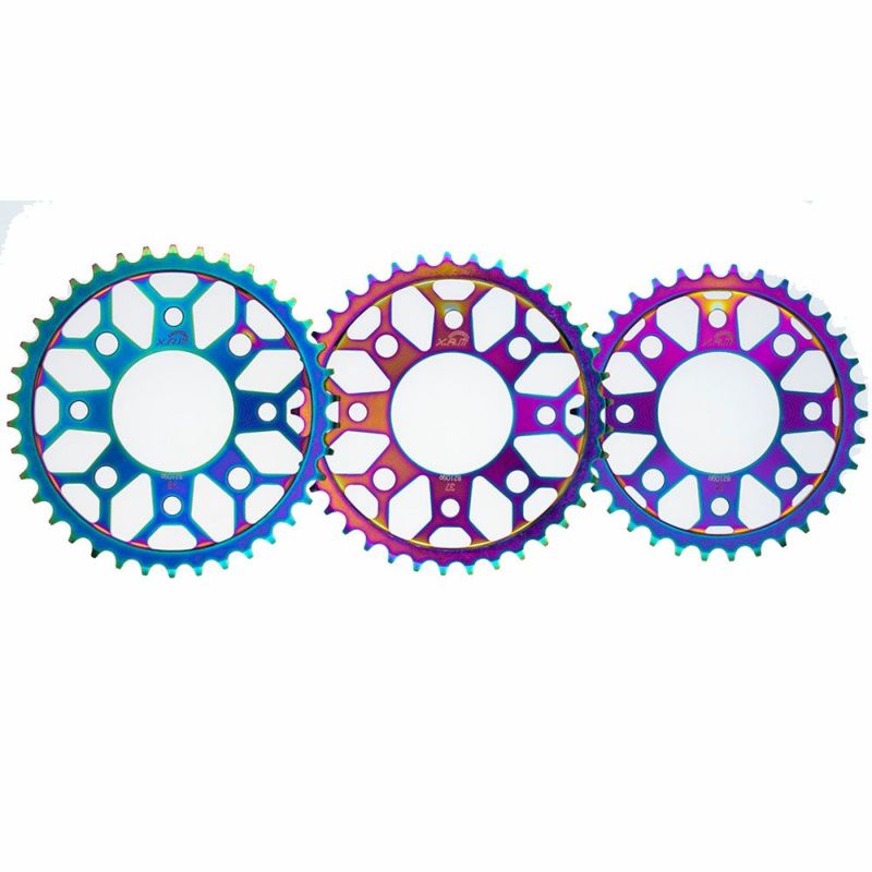 ミニバイク用タフライトスチールスプロケットは、強度に優れる鋼鉄材料に大胆な肉抜き加工を施し、色鮮やかな特殊メッキ加工で注目度抜群!