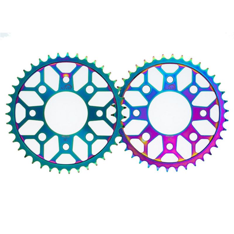 ミニバイク用タフライトスチールスプロケットは、強度に優れる鋼鉄材料に大胆な肉抜き加工を施し、色鮮やかな特殊メッキ加工で注目度抜群!