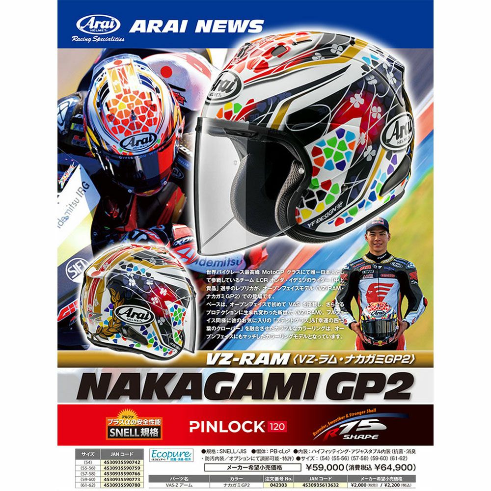 Arai アライ ヘルメット さらなるプロテクション進化のステージに生まれ変わり、ライダーの新しい楽しみを広げる新世代オープンフェイス Arai アライ ヘルメット VZ-RAM NAKAGAMI GP2 ブイゼットラム (ナカガミGP2)