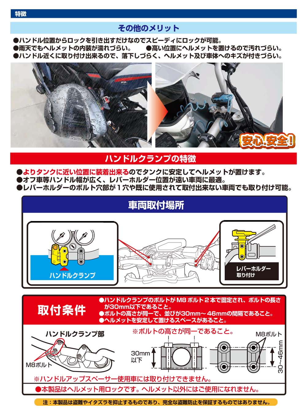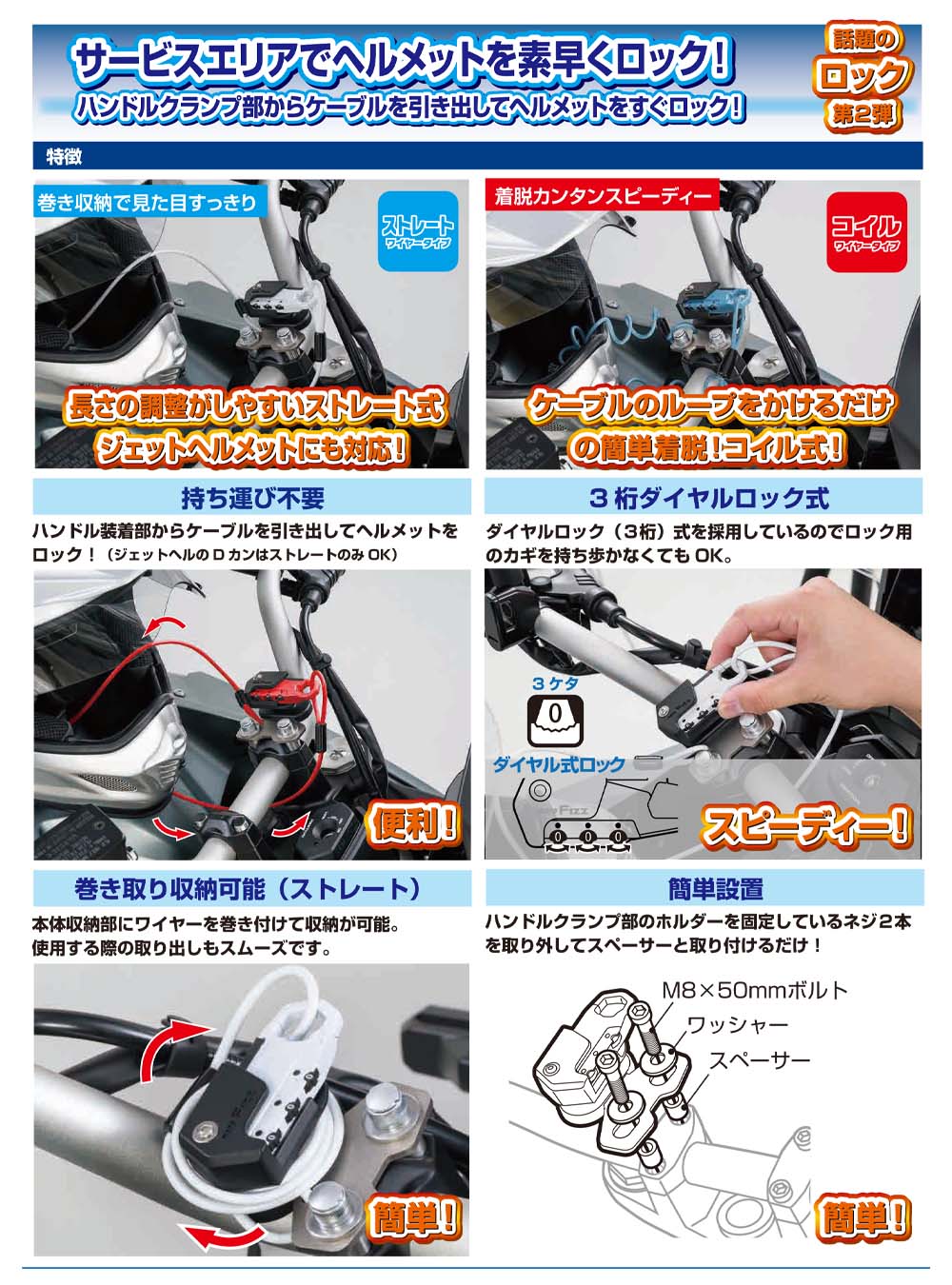 ・ワイヤーを伸ばしヘルメットに通すだけで簡単ロック。・素早く施錠し、スグに車両から安心して離れられます。