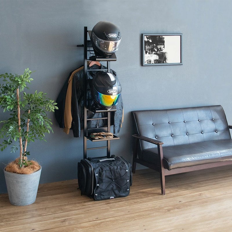 基本のヘルメットディスプレイスタンドに、追加用フックやディスプレイ棚各種を組み合わせて自分だけのバイク用品収納をお楽しみいただけます。