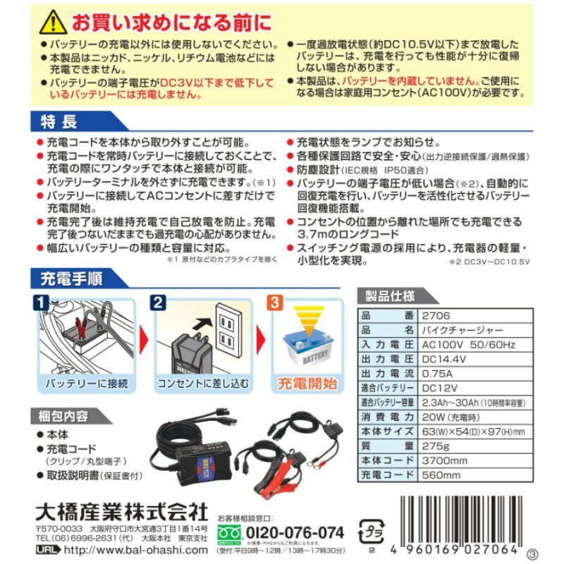 A:バッテリー容量にて選定していただきます。詳しくはBAL (大橋産業株式会社 )ホームページの取扱説明書を確認してください。