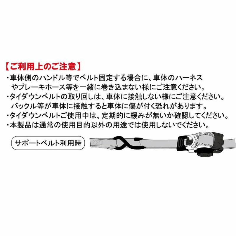 ●タイダウンベルトの取り回しは、車体に接触しない様にご注意ください。バックル等が車体に接触すると車体に傷が付く恐れがあります。