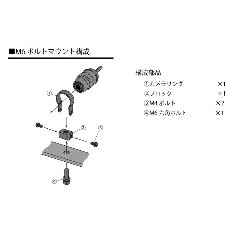EDRシリーズのカメラを直径6mmの穴へ取り付けする為のマウントです。バイクに多く利用されるM6サイズのボルトを採用。フロントカメラ、リアカメラ共に使用可能です。