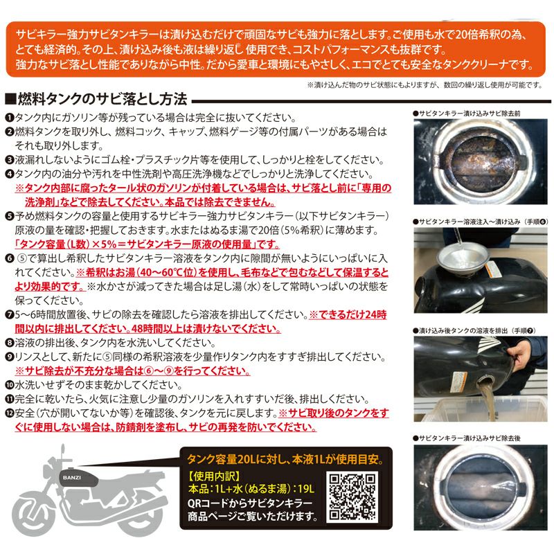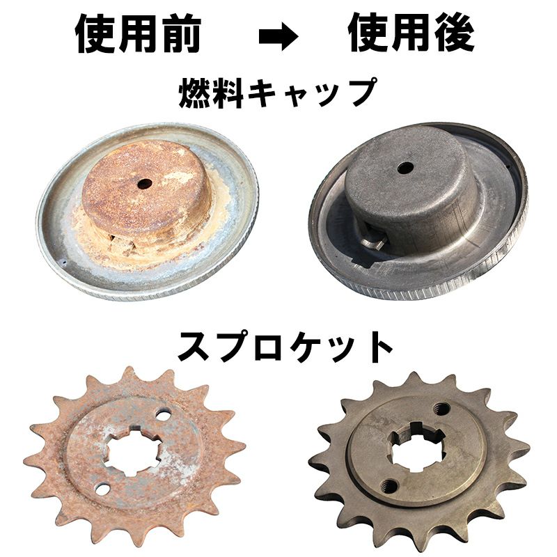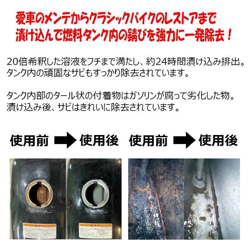 タンクに希釈したサビタンキラー溶液を注ぎ待つだけで、タンク内のサビがきれいに除去されます。※本製品ではタンク内部の腐ったタール状のガソリンは除去できません。専用の洗浄剤などで除去してください。
