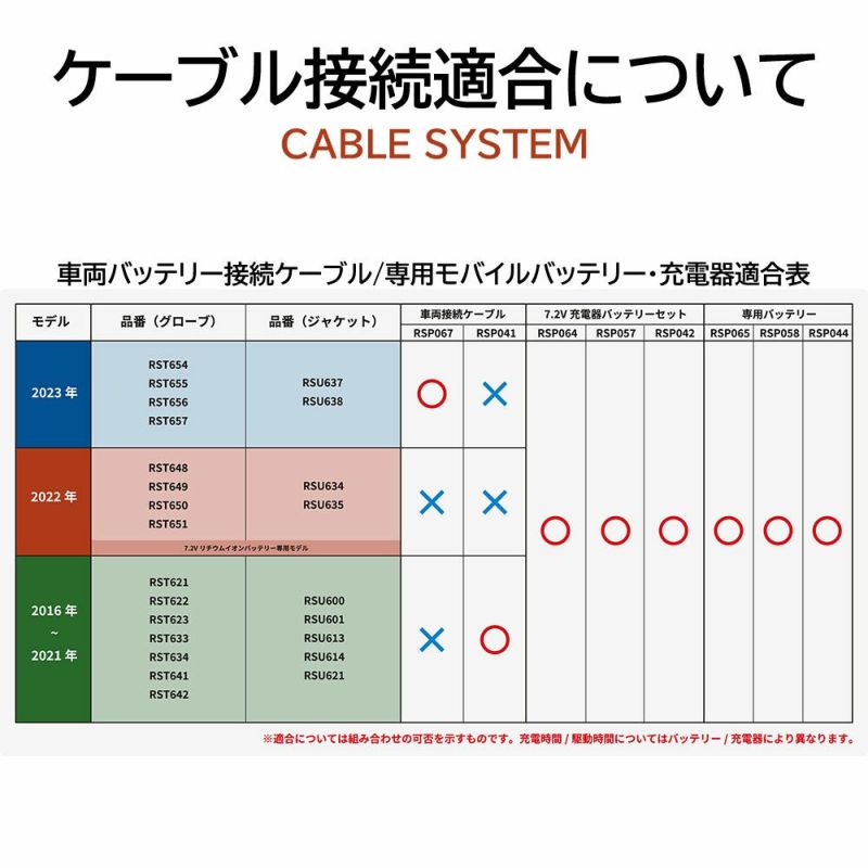 本製品と2021年以前発売の車両接続ケーブルは接続できません。e-HEAT 車両バッテリー接続ケーブルセット(RSP067)と併せてご使用ください。 ※2022年発売の車両接続ケーブルの設定はございません。 -