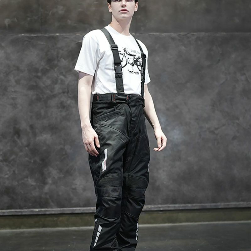 着脱可能なサスペンダーや保温ライナーを備え利便性を向上したウインターライディングパンツ。