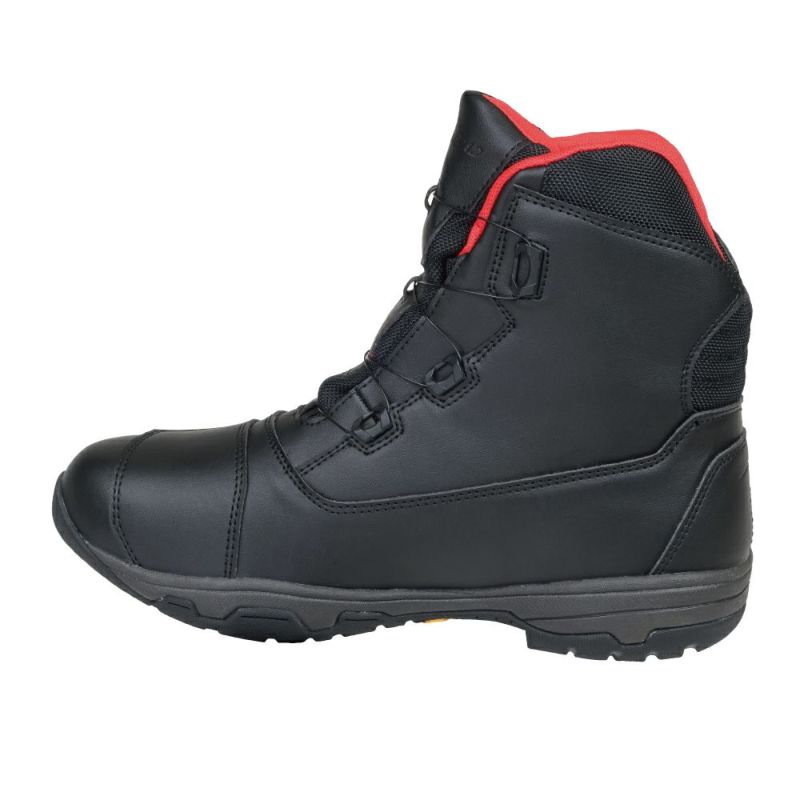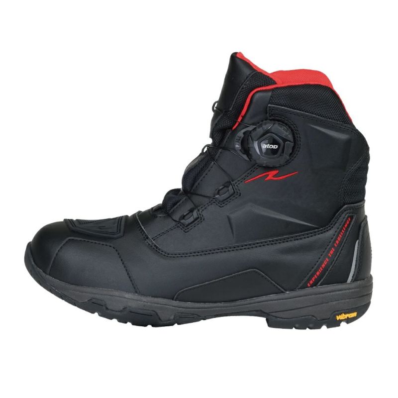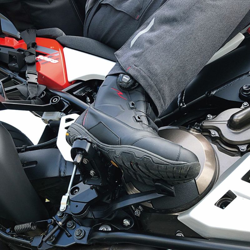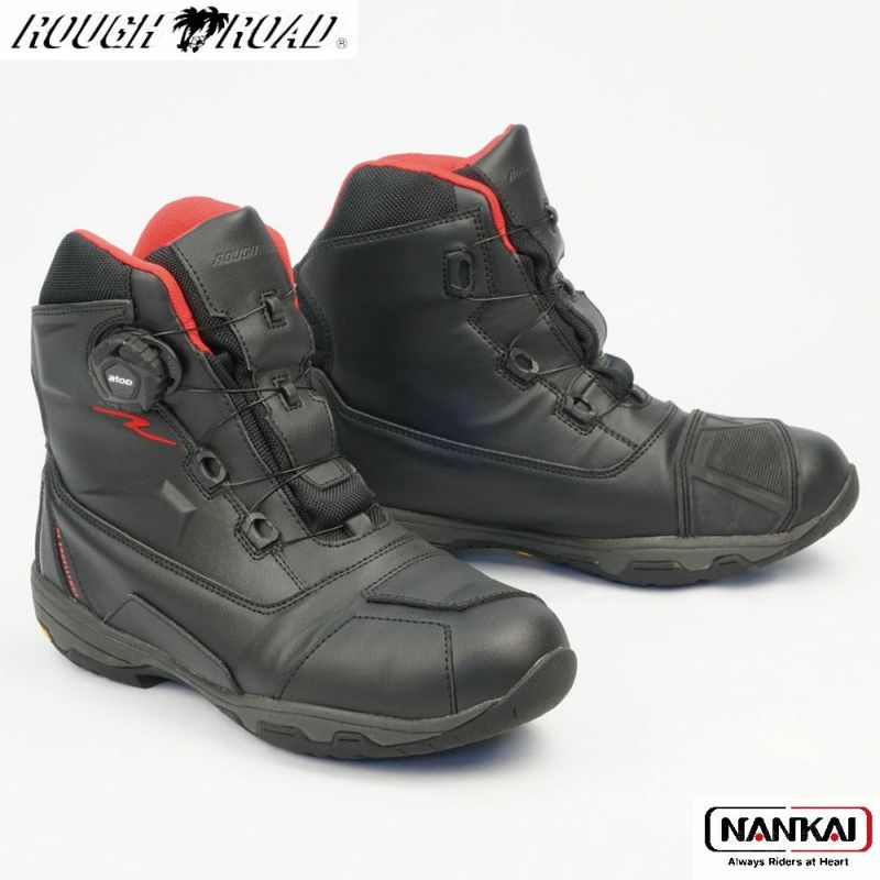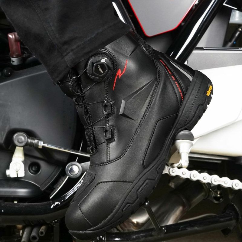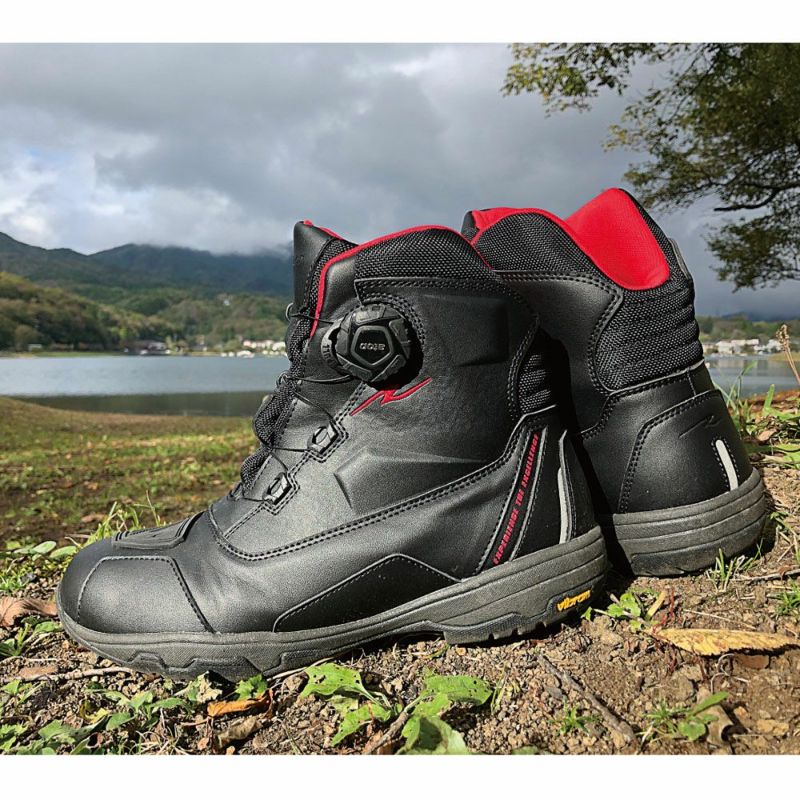 圧倒的にスピーディな着脱を可能にするダイヤルワイヤーシステム「a-top」、アウターソールのトップブランド「Vibram(R)?ソール」のうちモーターサイクルに最適なものを採用した、ラフアンドロードが送る防水透湿ライディングシューズ。
