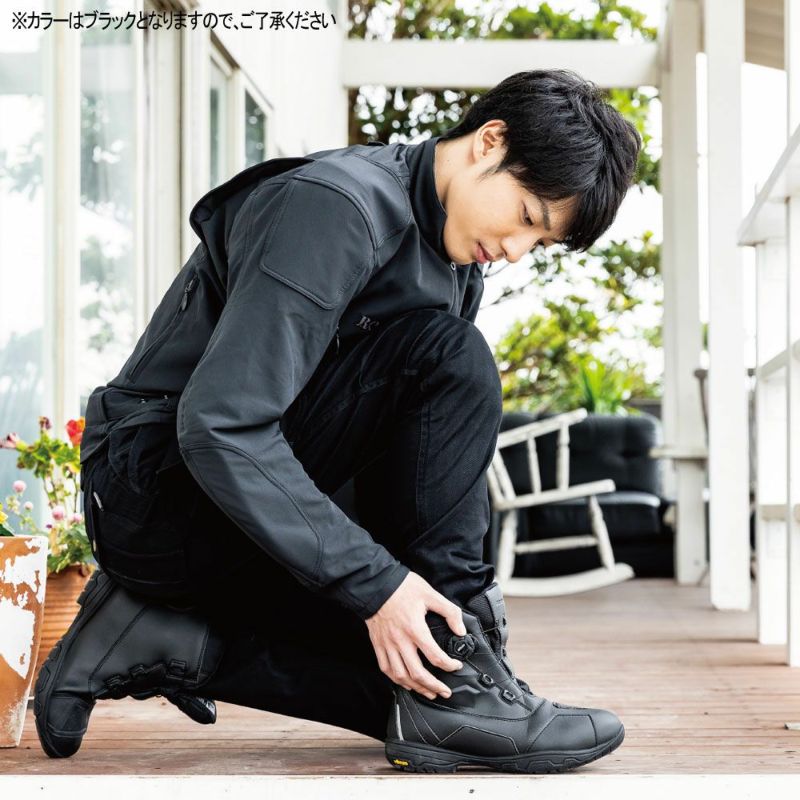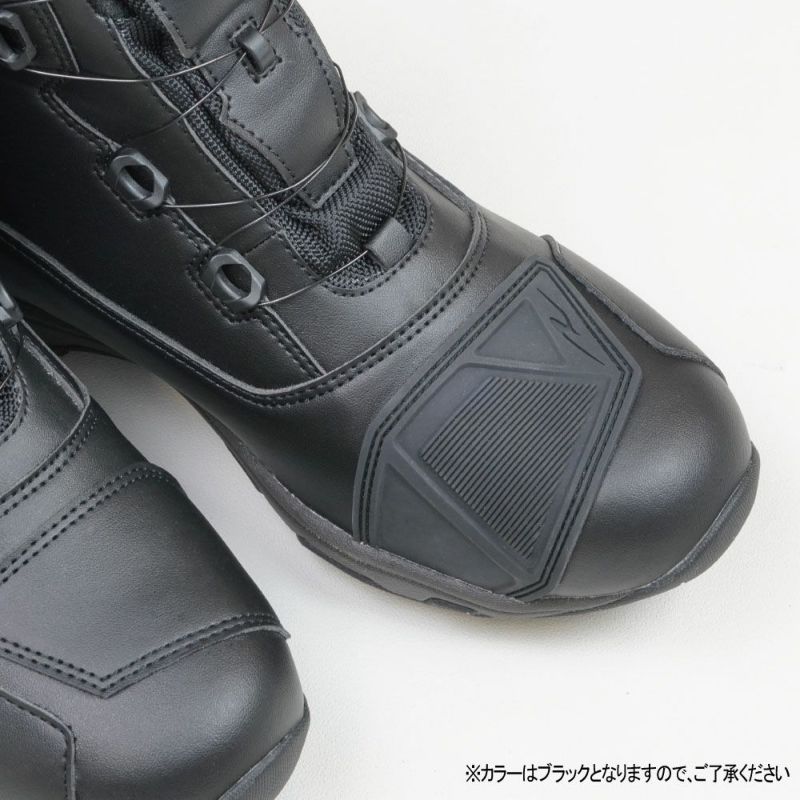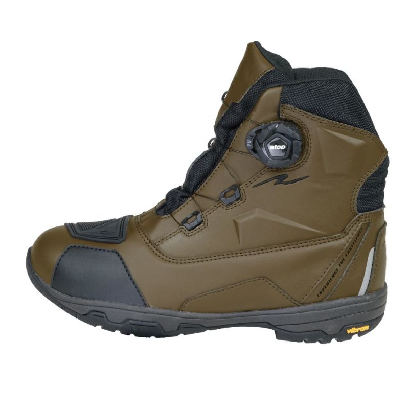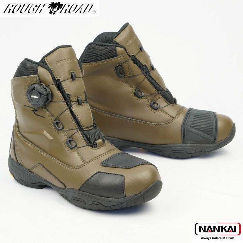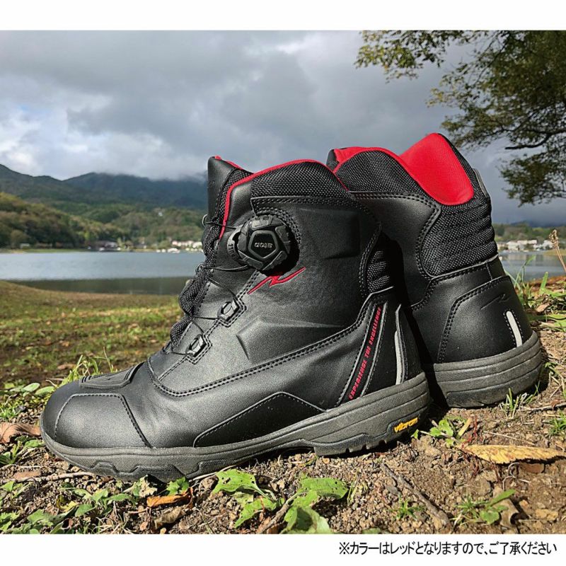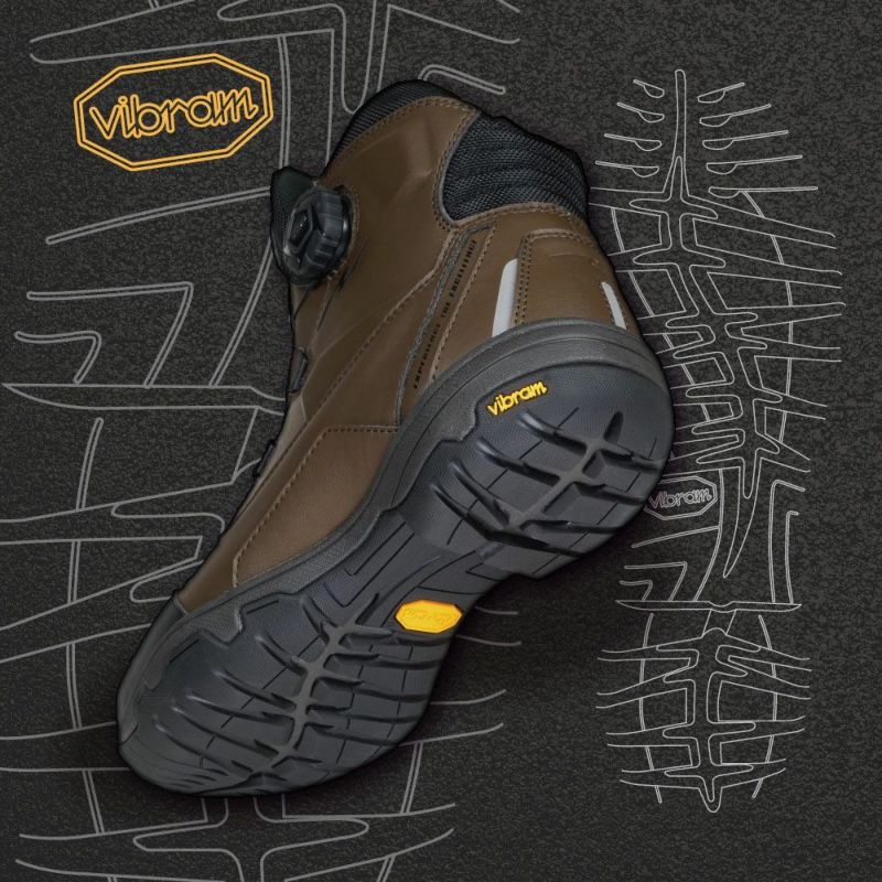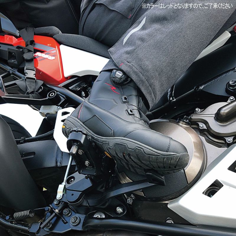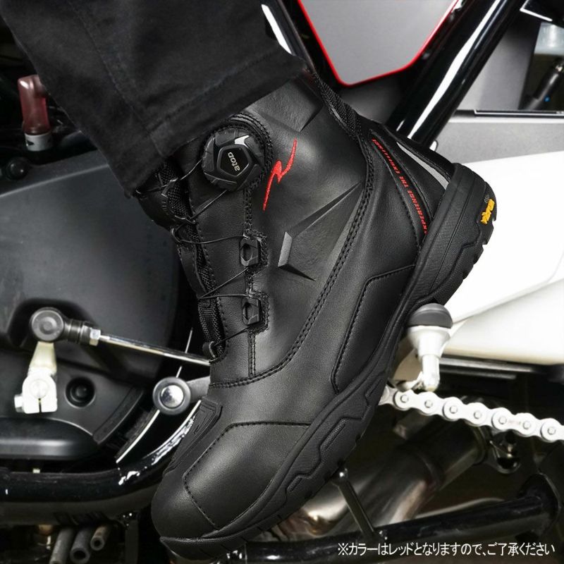 圧倒的にスピーディな着脱を可能にするダイヤルワイヤーシステム「a-top」、アウターソールのトップブランド「Vibram(R)?ソール」のうちモーターサイクルに最適なものを採用した、ラフアンドロードが送る防水透湿ライディングシューズ。