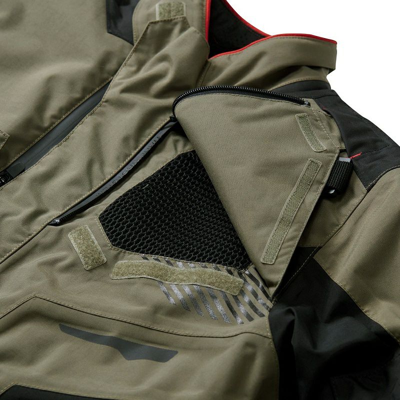 雨天走行時を快適にする防水透湿素材に加え、暑さをしのぐ大型ベンチレーションも採用することで全天候に対応するアドベンチャーコンセプトジャケット。