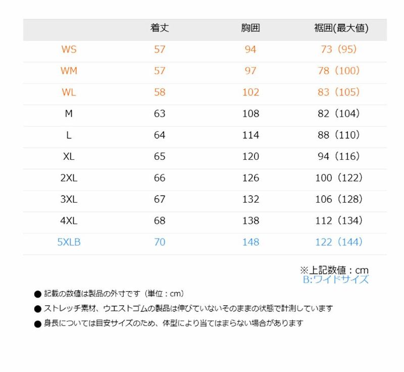 ■サイズ:WS、WM、WL、M、L、XL、XXL(2XL)、XXXL(3XL)、4XL、5XLB