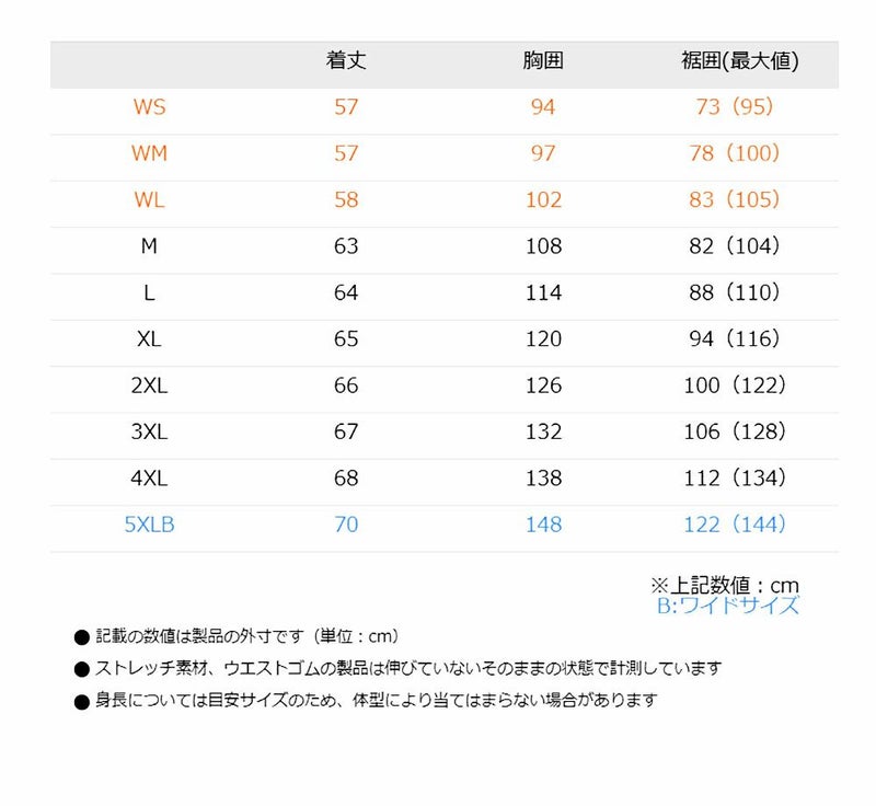 WS、WM、WL、M、L、XL、XXL(2XL)、XXXL(3XL)、4XL、5XLB