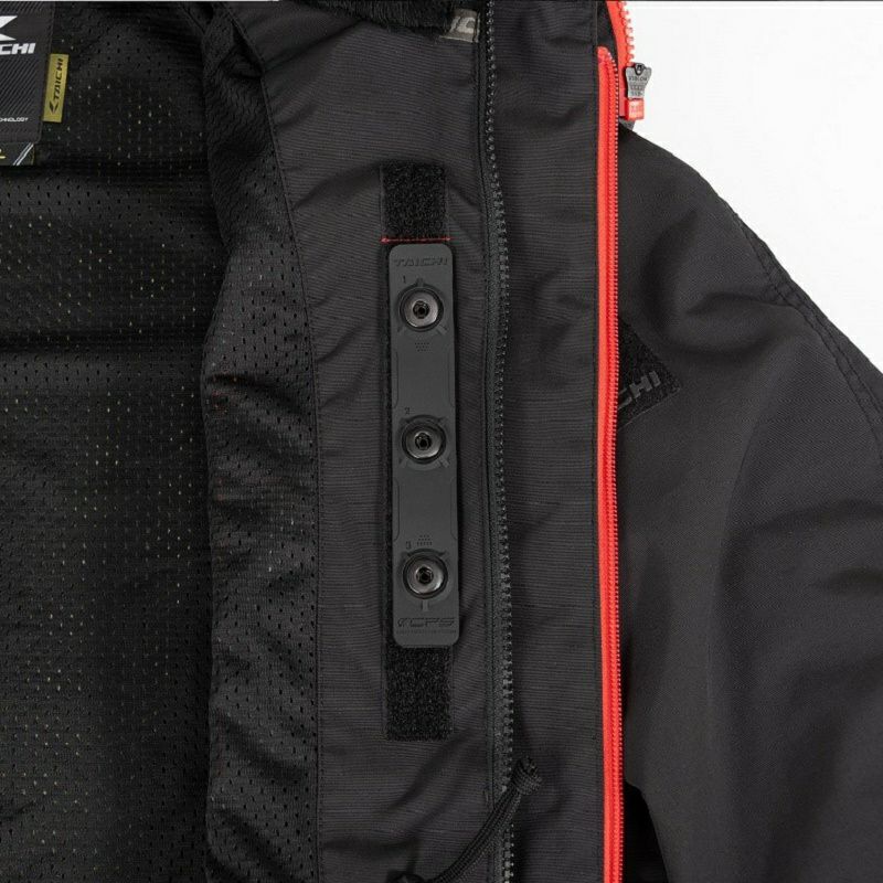 胸部プロテクター(別売品)は胸元のスナップボタンで簡単に装着可能。固定ボタンは、ベースごと上下に無段階調整できる仕様に。