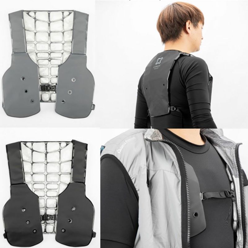 ●空調ウエアーのインナーとして使用でき、ベスト裏側のPCMブロックにエアー吹き抜け通路を設けることによって空調ウエアーの風が吹き抜けムレを解消