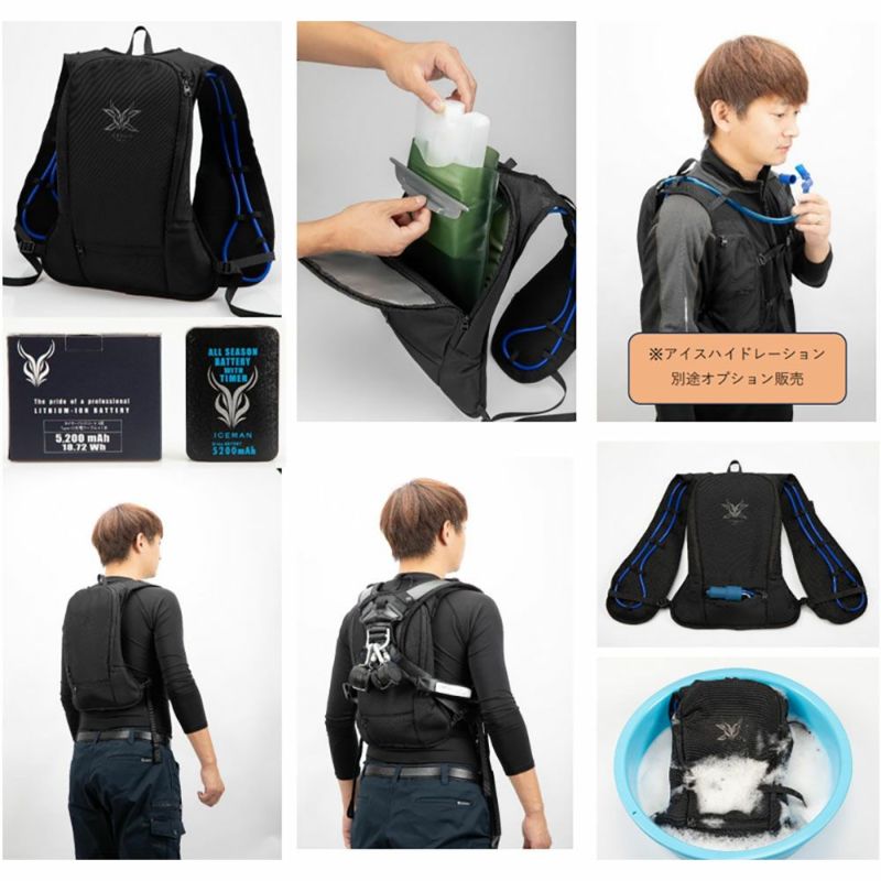 ●アイスマンProXにアイスハイドロレーションを取り付ける事で空調ウエアの中に使用できいつでもどこでも水分補給ができる。